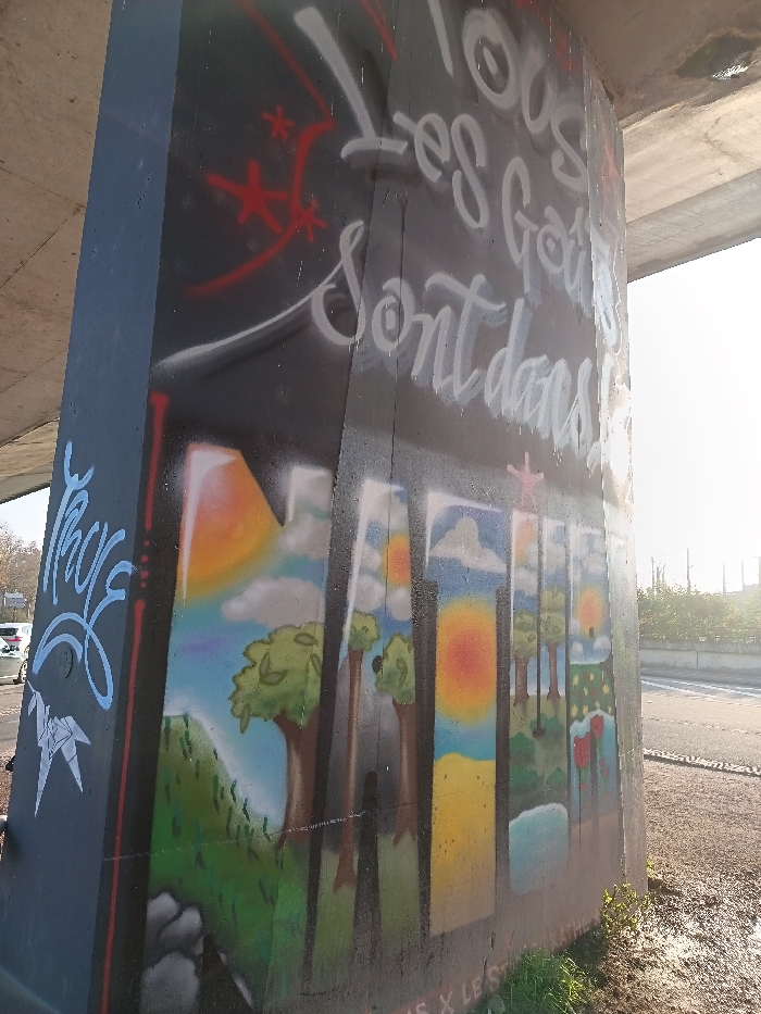 A concrete pillar, part of an overpass structure, stands in Strasbourg, France. The pillar is vertically oriented, slightly wider at its base, and made of grey concrete, partially obscured by various forms of graffiti. The upper half of the pillar face displays white spray-painted French text, partially legible as "Tous Les Gais Sont dans!", accompanied by red star-shaped symbols and curved lines. Below this, a multi-panel mural is painted, depicting an abstract natural landscape. This mural features green hills, brown trees with green foliage, blue skies with white clouds, and orange suns, rendered in vibrant, distinct vertical segments. On the far left side of the pillar, additional blue graffiti, possibly a tag, is present. The ground surrounding the base of the pillar consists of dirt and gravel, with small patches of green vegetation. To the immediate right, a paved road surface is visible, suggesting the pillar is adjacent to a roadway. In the distant background on the left, several vehicles are faintly discernible. The scene is brightly illuminated by natural sunlight, casting no significant shadows directly visible on the pillar face. No individuals or specific actions are depicted.