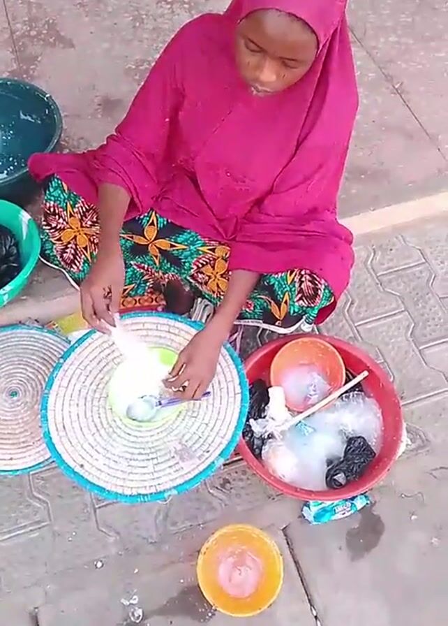 A young woman wearing a pink hijab and a colorful patterned skirt is sitting cross-legged on a gray tiled surface. She is in the process of mixing something in a small green bowl that is placed on top of a woven, circular mat. Around her, there are several plastic bowls in different colors (red, green, and orange). Some of the bowls contain bags, possibly filled with ingredients, while others appear to hold the mixture she is preparing. The environment suggests an outdoor setting, possibly a street or a public space. She is focused on her task, carefully stirring the contents of the bowl.