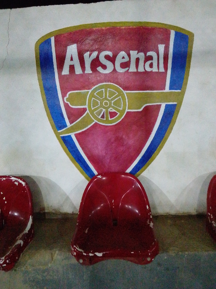 A painted rendition of the Arsenal football club logo adorns a white wall. The logo features the team's name in white letters above a yellow cannon, all set against a red shield with a blue border. Below the logo, red plastic stadium seats are visible, suggesting this might be a seating area at a sports venue. The seats appear aged, with some showing signs of wear and tear.