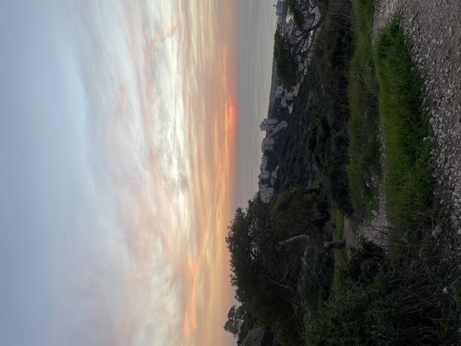 The image presents a panoramic view of a coastal city at twilight, observed from an elevated, vegetated hillside. The location is the city of Haifa, Israel, specifically from a vantage point on Mount Carmel overlooking the Mediterranean Sea. The sky occupies the upper half, displaying a gradient of colors from light blue at the zenith to soft pink, orange, and yellow hues near the horizon, indicative of either sunset or sunrise. Wispy, stratified clouds are scattered across this colorful expanse. Below the sky, the calm, dark blue-grey Mediterranean Sea stretches across the mid-horizon, with a distinct orange glow where the sun's disc appears to be positioned just above or at the waterline. Along the coastline, a dense urban development comprising numerous multi-story buildings is visible, primarily light in color. A winding road can be seen descending the hillside towards these coastal structures. To the far right, a port facility with discernible infrastructure and potentially vessels is present. The foreground and midground consist of a verdant hillside covered in various forms of vegetation. Dark green trees and dense shrubs dominate the slopes. A notable tree with a gnarled, twisted trunk stands prominently in the left-midground. Patches of lighter green grass are interspersed among the darker foliage, particularly in the immediate foreground. A winding, unpaved path, composed of light-colored gravel and dirt, traverses the lower portion of the image, curving from the lower right towards the center and disappearing into the dense vegetation. No individuals, animals, specific human-made objects (beyond the distant buildings and port infrastructure), or overt actions are discernible within the frame.