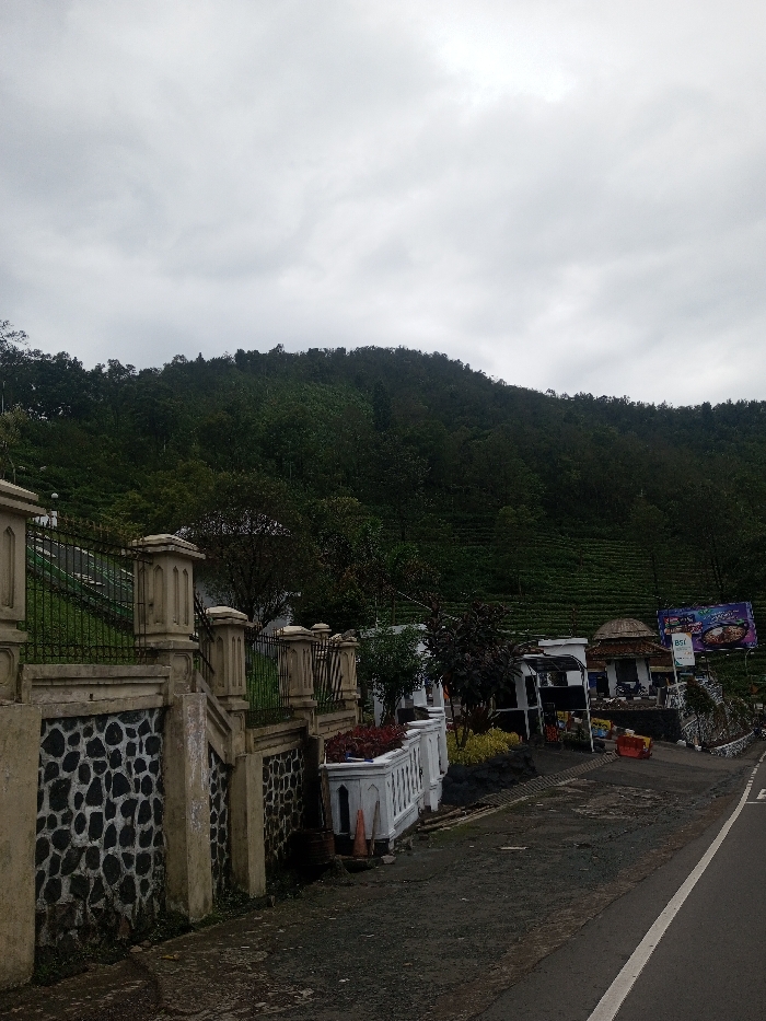 The scene depicts a mountainous landscape under an overcast sky, located in the city of Ariyalai, Sri Lanka. In the background, a large, dark green mountain or hill rises, densely covered with foliage and exhibiting terraced cultivation on its lower slopes. The foreground features a paved road on the right side, marked with a solid white line at the edge and a dashed white line further left. Adjacent to the road, on the left, a multi-layered retaining wall is visible, constructed from a concrete base with embedded dark, irregular stones, topped by a light-colored concrete fence with square pillars and dark metal railings. Behind this fence, green grass and trees are present. To the right of the road, on an unpaved shoulder, a cluster of structures includes a building with a distinctive domed, textured roof and light-colored walls. Above and behind these buildings, a large billboard displays colorful graphics and the "BSI" logo. Decorative plantings and an orange traffic cone are also visible near the roadside structures. No individuals are present or engaged in any actions or interactions within the frame.