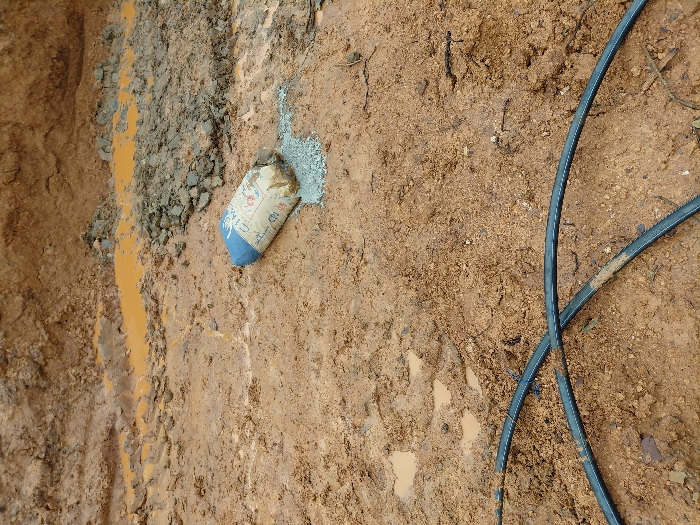 A narrow trench reveals layers of soil and rocks. Brown mud and a line of orange liquid run along the trench's edge. A blue and white package, partially buried, sits near loose grey material. Two black tubes snake across the reddish-brown, muddy ground, which is littered with small pieces of organic matter.