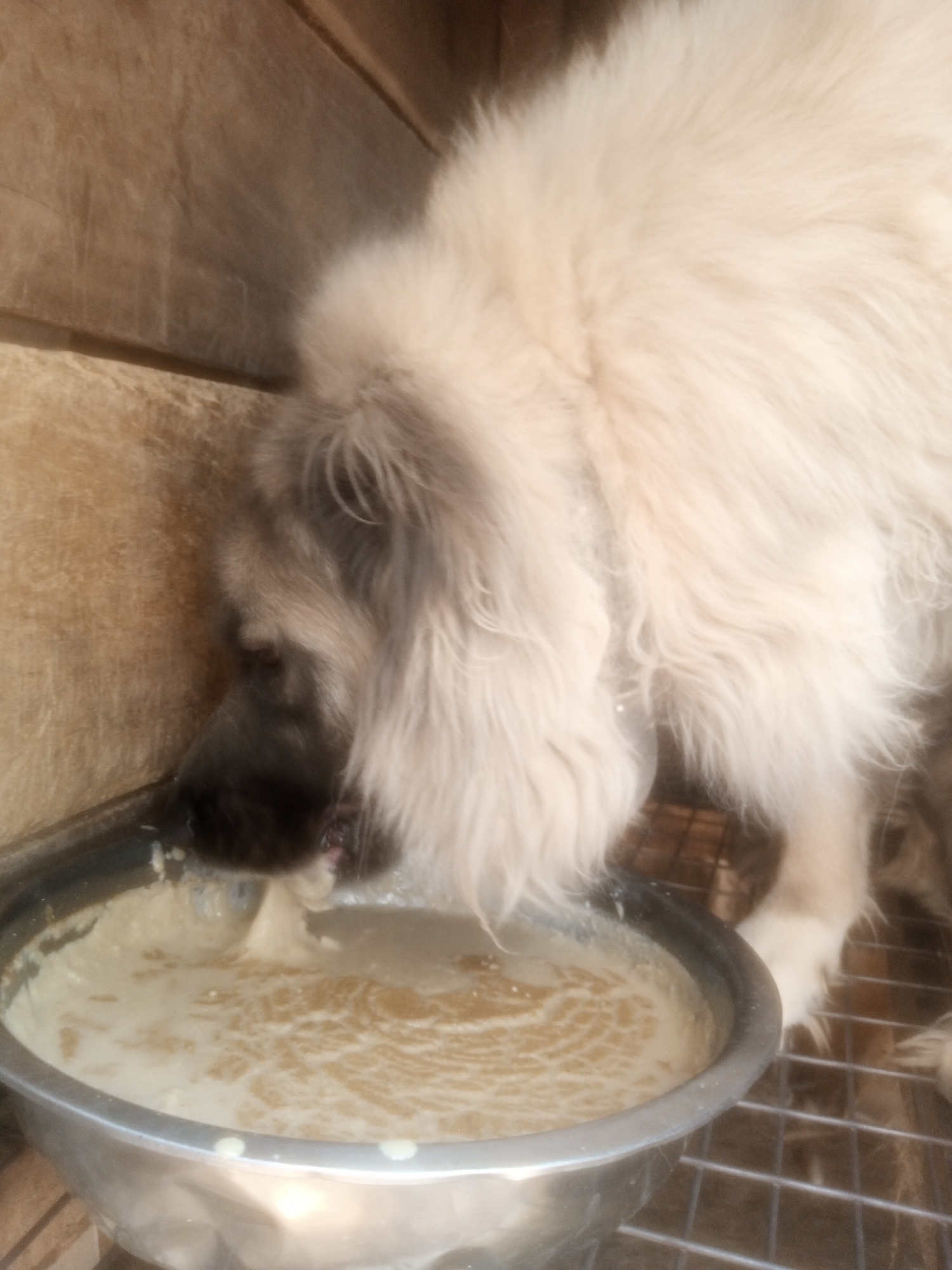 - "A large, long-haired dog is depicted consuming liquid from a metallic bowl" by FM-haWNv2, licensed under CC BY 4.0