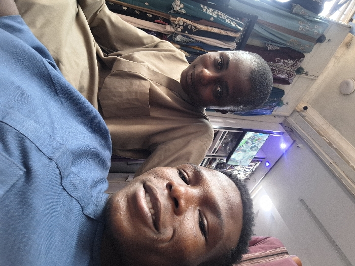 Two individuals are captured in a selfie within an indoor retail clothing establishment in Fagge A, Nigeria