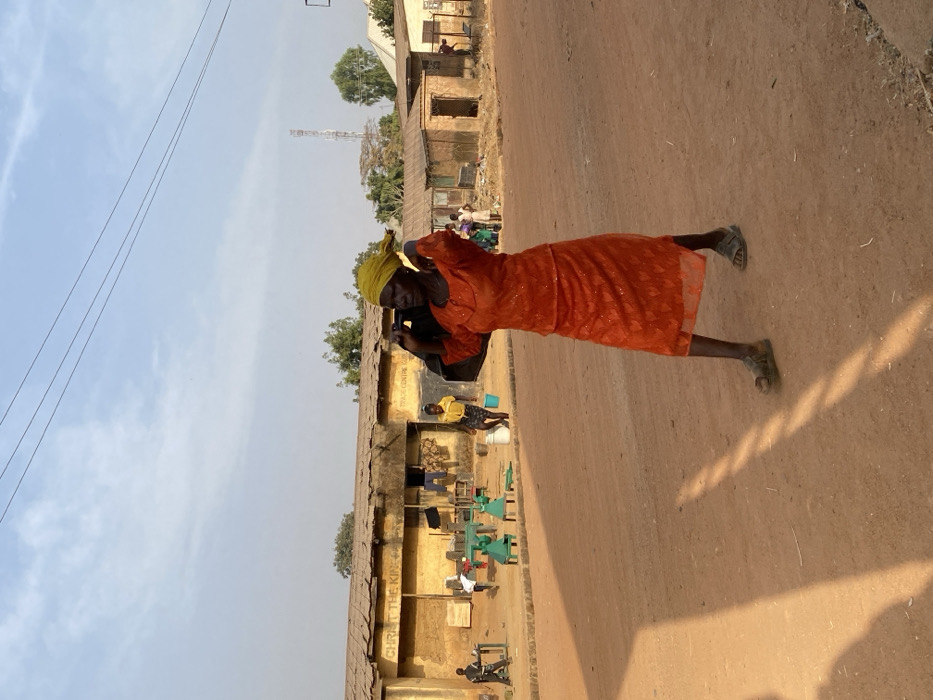 An older woman wearing an orange dress and a yellow head wrap is standing on a dirt road. She appears to be holding something on her head with her hands. To her left is a weathered building with people and objects around it. A communication tower is visible in the background. The sky is partly cloudy.