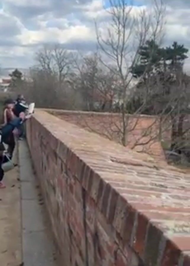 group of people standing next to a brick wall, looking over it at a distant cityscape. There are four people visible, mostly women, helping each other look over the wall. The background is a landscape with buildings and trees under a cloudy sky. The camera pans over the wall to show the view, which includes a large church with tall spires.