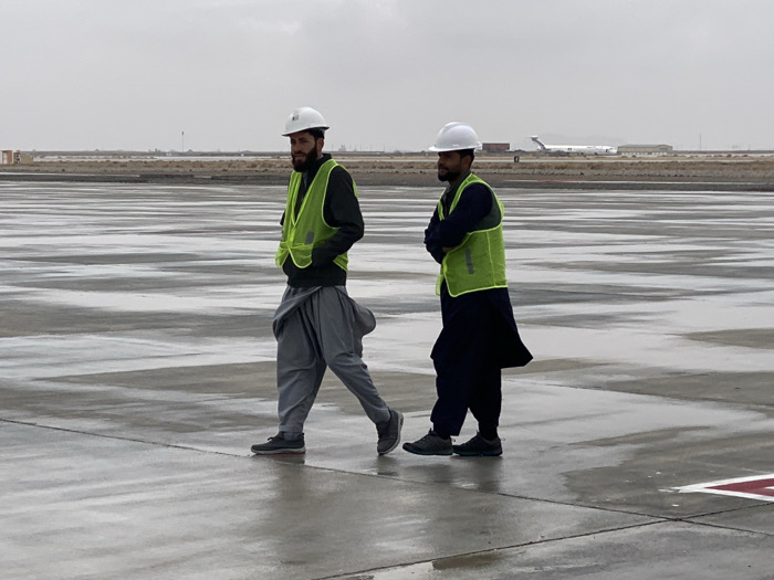 - "Two adult males are depicted on a wet asphalt or concrete airport tarmac under an overcast sky, located at an airport in Unknown, Afghanistan" by FM-B5wmg2, licensed under CC BY 4.0