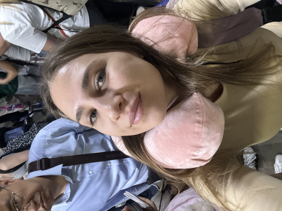A female individual is depicted in a close-up, selfie-style photograph within a crowded indoor public space, identified as potentially Phuket International Airport in ตำบล ไม้ขาว, Thailand. The subject, appearing to be in her 20s or 30s, has long brown hair, light skin, and green eyes, and displays a subtle smile towards the camera. She wears a light-colored, long-sleeved top and a pink velvet U-shaped travel neck pillow. A dark brown backpack strap is visible over her right shoulder. Behind and to the left of the main subject, a male with glasses, wearing a light blue collared shirt, is partially visible, carrying a dark brown messenger bag with "BOSTA" printed on its strap. His expression is neutral. Further background elements show additional indistinct individuals and partial views of luggage, consistent with a busy travel terminal environment. The lighting is artificial and bright.