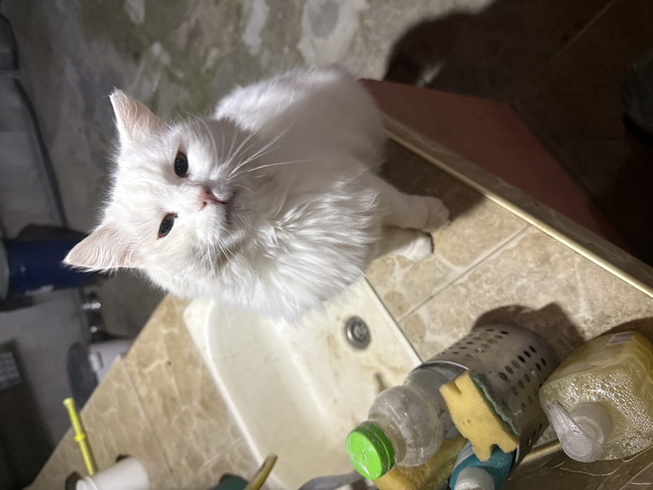 - "In Balinovtsi, Bulgaria, a medium-sized, long-haired white cat stands on a tiled countertop, looking forward and slightly upward" by FM-bBbbe2, licensed under CC BY 4.0