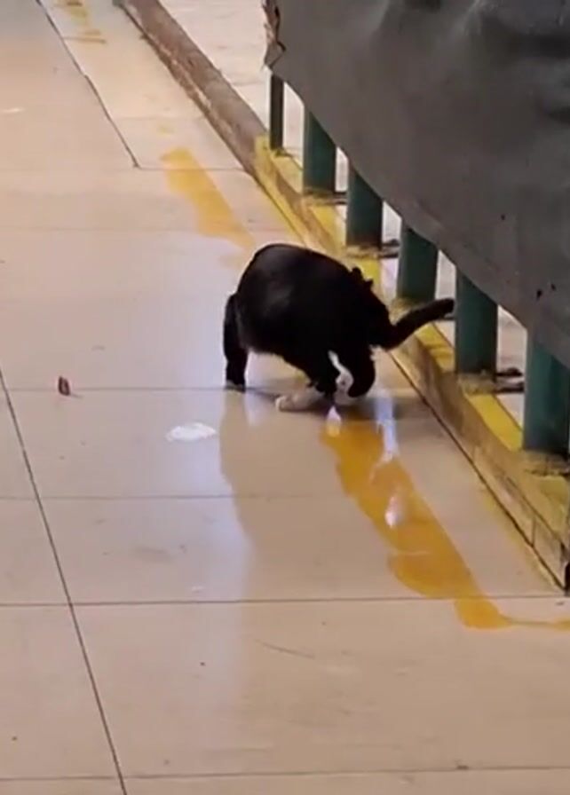black cat with white paws near a barrier that has a dark gray curtain. The floor is made of light beige tiles, and there is a small amount of spilled yellow liquid running next to the barrier. A person in light tan pants walks by in the background. The cat moves between the vertical bars of the barrier, seemingly investigating the area.