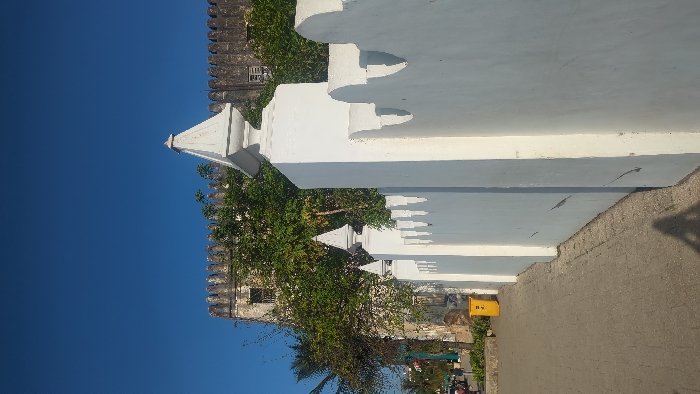 The image captures an outdoor scene in Stone Town, Zanzibar City, Tanzania, specifically near the Old Fort (Ngome Kongwe). In the foreground, a white plastered wall extends from the lower right, featuring regularly spaced square pillars topped with pointed finials and alternating scalloped, crenellated sections. The wall exhibits minor surface wear. To the left of this wall, a grey paved walkway is visible. A yellow cylindrical trash bin, marked "J.R.", stands on the left side of the walkway. The background reveals a large, weathered stone building with crenellated battlements along its roofline, partially obscured by dense green foliage, including several trees. The sky is clear and deep blue. A distinct human-like shadow is cast on the paved ground in the lower central portion of the frame. No discernible individuals or explicit actions are present in the scene.
