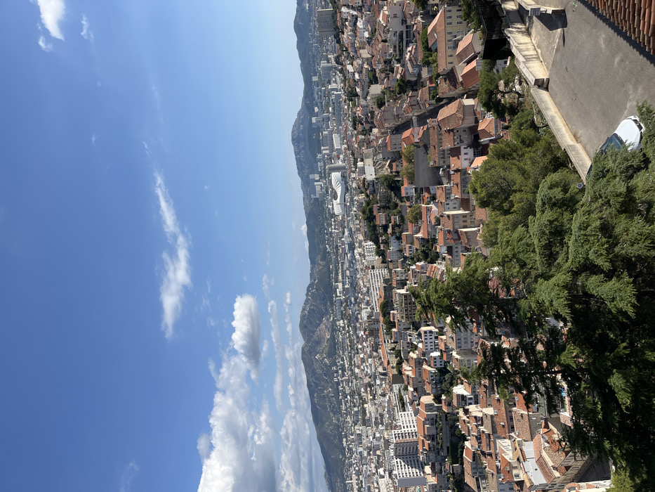 This image presents a panoramic, high-angle view of the city of Marseille, France, observed under clear blue skies with scattered white cumulus clouds. The vantage point is elevated, likely from a southern hillside overlooking the urban sprawl towards the north or northeast. In the foreground, dense green coniferous trees occupy the lower left and central-right portions. A dark gray asphalt path or road slopes downwards in the lower right, bordered by a light-colored concrete retaining wall. A white sedan is partially visible parked on this path in the bottom center-right. The midground is dominated by a densely packed urban landscape. Numerous buildings, predominantly multi-story, display a mix of traditional red-tiled roofs and flatter, lighter-colored rooftops. Building facades are mostly in light tones of white, cream, and beige. Streets and minimal green spaces are interspersed throughout the urban grid. In the background, the city extends towards a range of rugged, rocky mountains that define the horizon. More modern high-rise structures are visible within the distant urban areas. A prominent white architectural structure, identifiable as the Orange Velodrome stadium, stands out in the mid-background, slightly to the right of center. No individuals or specific human activities are discernable within the scene.