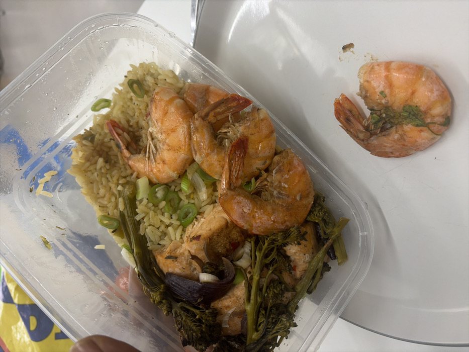 A clear, rectangular plastic food container is held by a human hand, primarily visible as a thumb and index finger, in the upper-left of the frame. The container holds a prepared meal consisting of light brown rice, several cooked, orange-colored prawns (some partially peeled with tails attached), light pink pieces of cooked salmon, dark green broccolini florets, and slices of purple onion. Green chopped scallions are distributed among the food items. Condensation or moisture is present on the interior surface of the container. Adjacent to the container, resting on a white, flat surface, is a single, cooked, partially peeled prawn with its tail segment still attached. A small, dark, granular food particle is located near this detached prawn. The white surface appears to be a table or countertop. A faint, curved line suggests the presence of a white plate partially obscured by the container. In the blurred background, a yellow and blue object is partially visible. The scene is illuminated by ambient light. This activity is occurring in New Forest, United Kingdom.