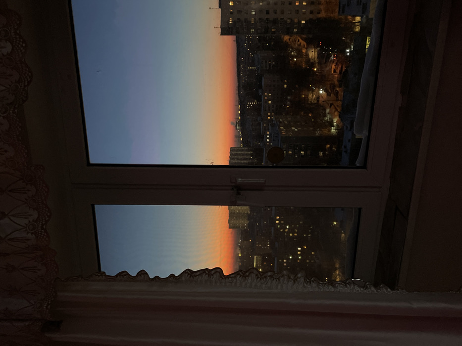 Through a closed, white-framed window, a dusky urban landscape is visible