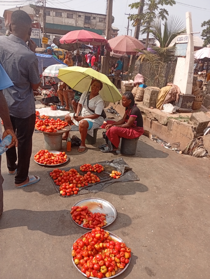 A bustling street market scene displays tomatoes arranged on plates and a black tarp