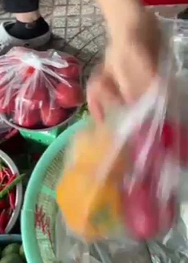 collection of vegetables and other food items at what appears to be an outdoor market. A person wearing a dark tracksuit, grey shoes, and socks is visible in the lower left corner. A second person, wearing a red garment, is also present but mostly obscured from view. A hand, presumably belonging to one of the individuals, reaches into a light green basket to retrieve a plastic bag containing yellow bell peppers. The person then closes the bag with a knot. Other items include tomatoes, cilantro, chili peppers, limes, onions, red onions, bananas, garlic, and ginger, all arranged in baskets and plastic bags. The ground is tiled with a grey geometric pattern.