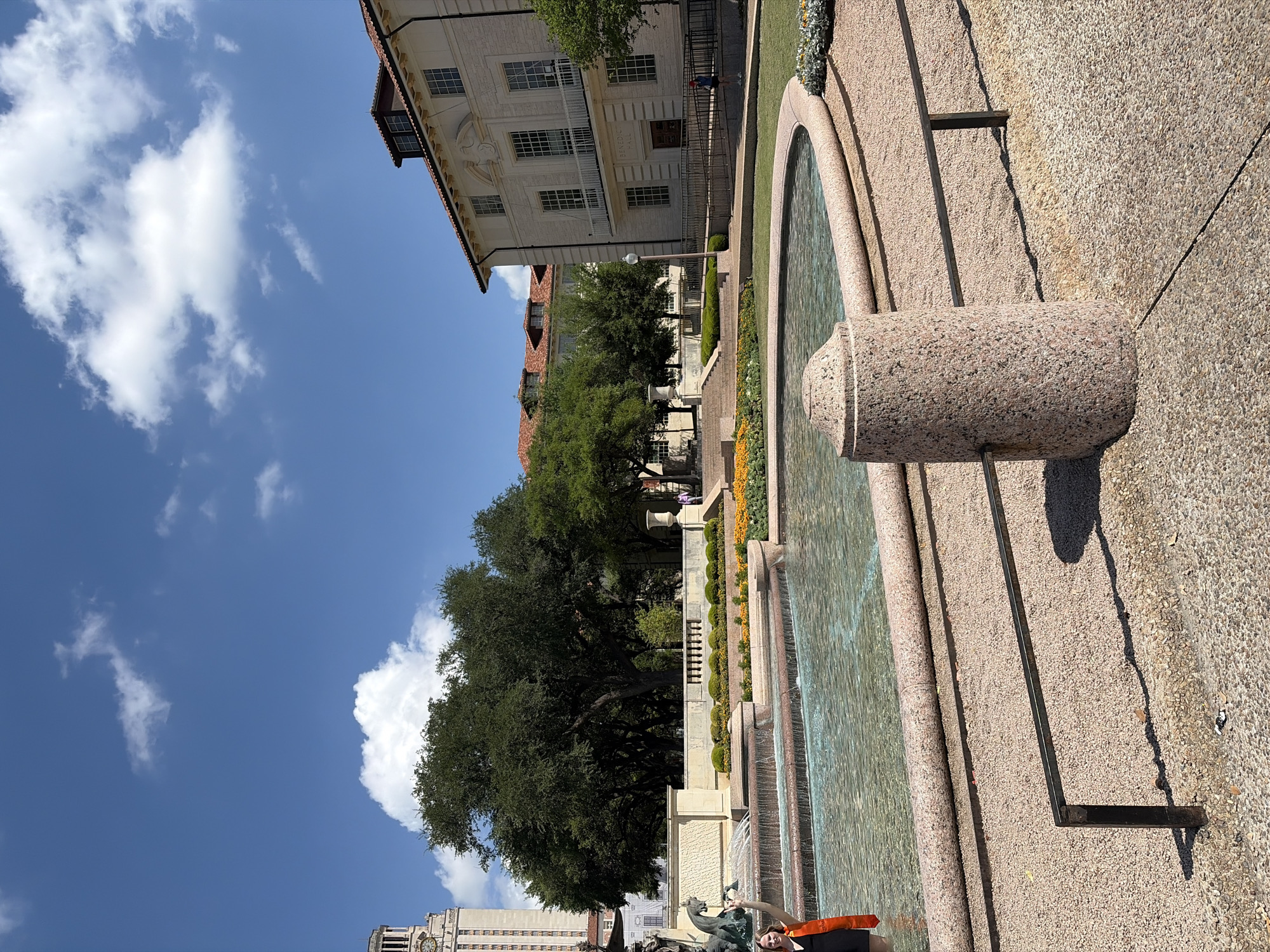 The image depicts the Littlefield Fountain at the University of Texas at Austin in Austin, Texas. The fountain is visible in the foreground, with water cascading down its tiers. Behind the fountain, there are manicured flower beds and greenery. The Main Building of the University, also known as the Tower, is visible in the lower left corner, and the architectural details of other buildings on campus are visible behind the greenery. The sky is bright blue with scattered clouds. A person in a graduation robe is partially visible at the bottom of the frame.