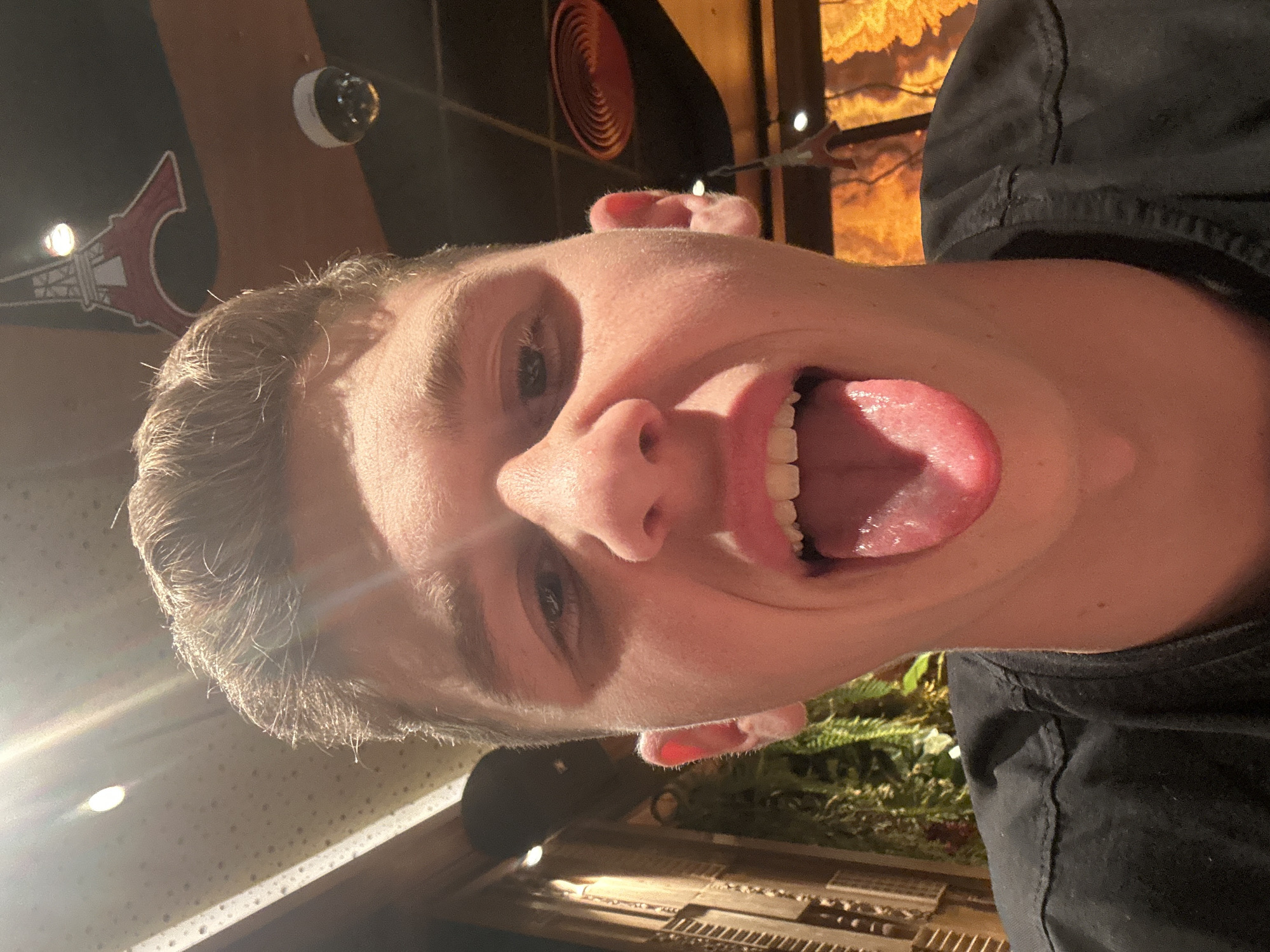 A medium-shot selfie of a fair-skinned person with short brown hair, positioned with their head tilted downward. They are sticking their tongue out of their mouth. The person is wearing a black shirt. Behind the person, there's an out-of-focus image of a red-and-white structure. A security camera is mounted nearby. Above the camera, there is a circular ventilation or speaker grill. To the right of the person, artificial plants are visible. The image is lit by overhead artificial lighting. The red-and-white structure is suggestive of a stylized depiction of the Eiffel Tower, which is featured in the logo of the "Paris Bar & Dinner" restaurant in Plovdiv, Bulgaria. This leads to the likely location of the photo being taken at or near that establishment.