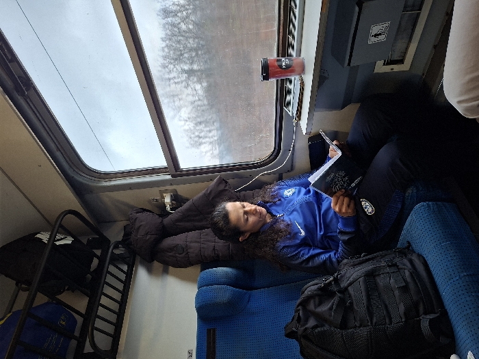 An interior view of a train compartment, likely in motion near Lyutibrod, Bulgaria, shows a female passenger seated on a blue upholstered seat on the left side of the frame. She has dark, curly hair pulled back and is wearing a blue athletic jacket with a white Nike logo and a Chelsea FC crest, along with dark athletic pants featuring a similar crest. She is focused on reading an open book with a dark cover. To her immediate left, on the same seat, a black tactical-style backpack rests. To her right, a small grey table attached to the window frame holds a red and black travel mug with a black lid and white text. Beyond the window, a blurred landscape of bare trees and an overcast sky is visible, indicating movement. Above the passenger, an overhead luggage rack contains a blue bag and a black bag. A dark brown padded jacket hangs from a hook below the luggage rack. A grey waste receptacle with a universal trash icon is located beneath the table. The lower right corner of the frame reveals a portion of a light-colored pant leg, suggesting the presence of another passenger out of view.