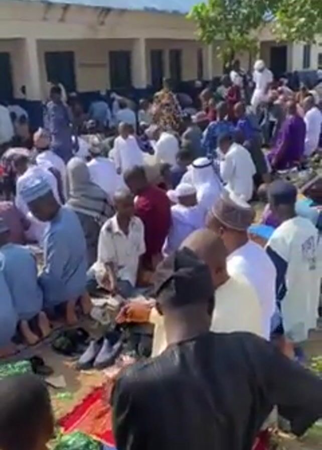 A crowd of people, mostly men and boys, are kneeling outdoors on prayer mats in what appears to be a yard or open area next to a building with a blue and white facade