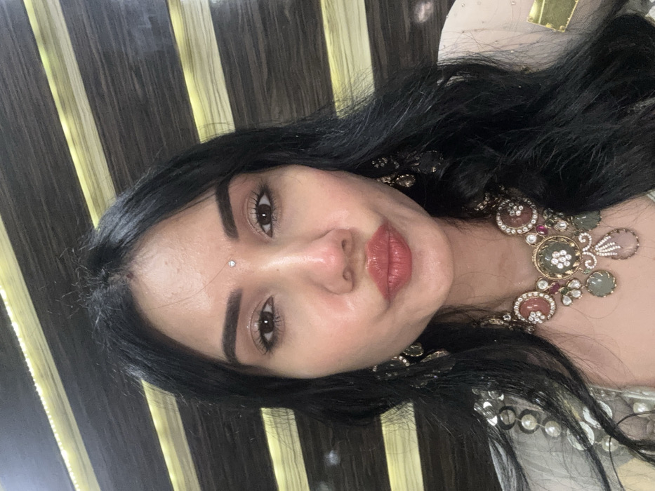 A close-up self-portrait depicts a woman with long, dark, wavy hair, looking directly at the camera with her lips pursed