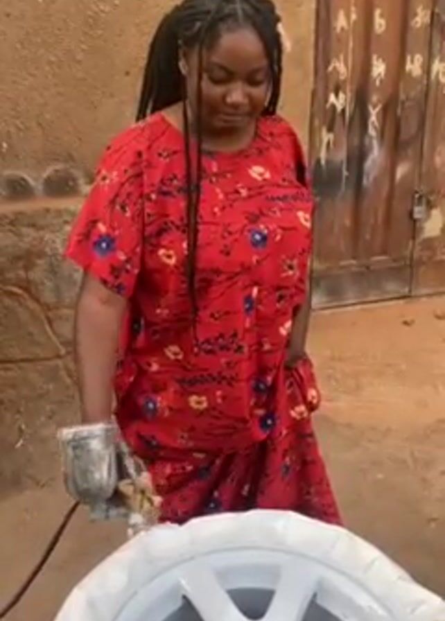 A woman in a red patterned dress with her hair in braids stands outdoors painting a car wheel white using a spray gun. The wheel is sitting on a tire. A weathered wall and a closed door with the word “XABA” written on it form the backdrop. The woman appears to pause and wipes her forehead before resuming the painting.