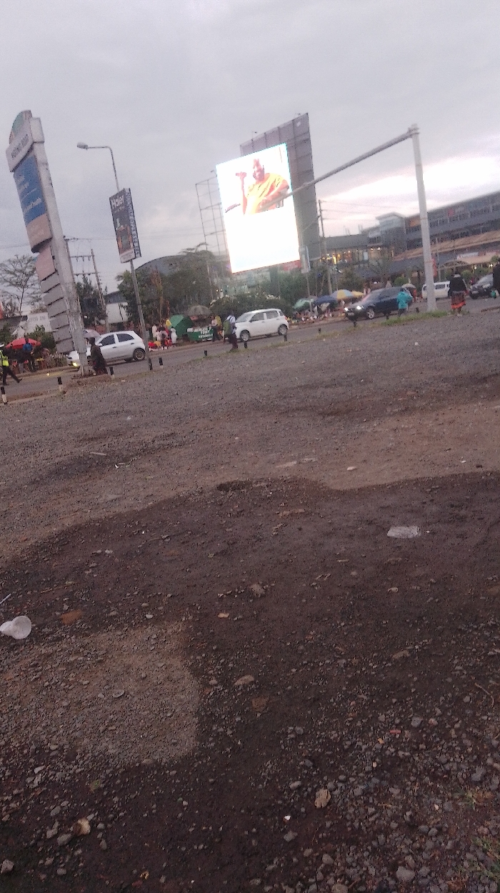 This is an eye-level, outdoor photograph of a street scene in Nairobi, Kenya, captured under an overcast sky, likely at dusk or dawn. The foreground comprises a dark brown, unpaved gravel and dirt lot, exhibiting uneven terrain and scattered debris, including a white plastic cup in the lower-left corner. In the midground, an asphalt road traverses horizontally, carrying light vehicle traffic and multiple pedestrians. A white compact car is positioned on the left, near a person wearing a reflective vest. Further right, a dark-colored sedan and another white compact SUV/hatchback are observed. Along the right side of the road, a line of street vendor stalls, characterized by colorful coverings, is occupied by several individuals. The background features urban infrastructure. On the far left, a tall, angled signage structure for "HOMEMART Nairobi" is partially visible, with a blue panel indicating "Medical Health". Adjacent to it, a vertical billboard for "Haier" is present. Centrally, a large, brightly illuminated digital billboard displays a smiling individual in an orange/yellow garment holding an object. Behind this, a prominent empty metal billboard frame is visible. Beyond the road and billboards, multi-story commercial buildings with illuminated interiors are discernible. A tall street light pole stands on the left. The location is identified by visible signage including "HOMEMART Nairobi" and "NAKUMATT ROAD", placing the scene specifically in the vicinity of the Lang'ata Road area or a nearby major intersection within Nairobi.