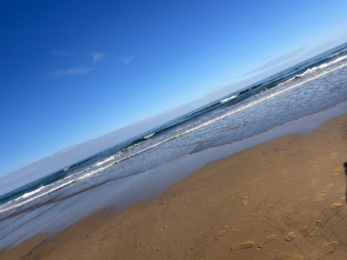 The image displays a coastal scene on the beach of Zarautz, Spain, under a clear blue sky with sparse, faint clouds. The horizon line is sharply tilted, diagonally spanning from the upper left to the lower right. The ocean, characterized by dark blue-green water, features multiple lines of white breaking waves receding towards the shore. A single individual is visible partially submerged in the water, positioned among the waves in the mid-right section of the ocean. The foreground consists of brown sand, transitioning from wet and compacted near the waterline to drier sand further up the beach. Several distinct human footprints are impressed into the drier sand. A dark, vertical object, possibly a shadow or part of an item held by the photographer, is partially visible along the extreme right edge of the frame.
