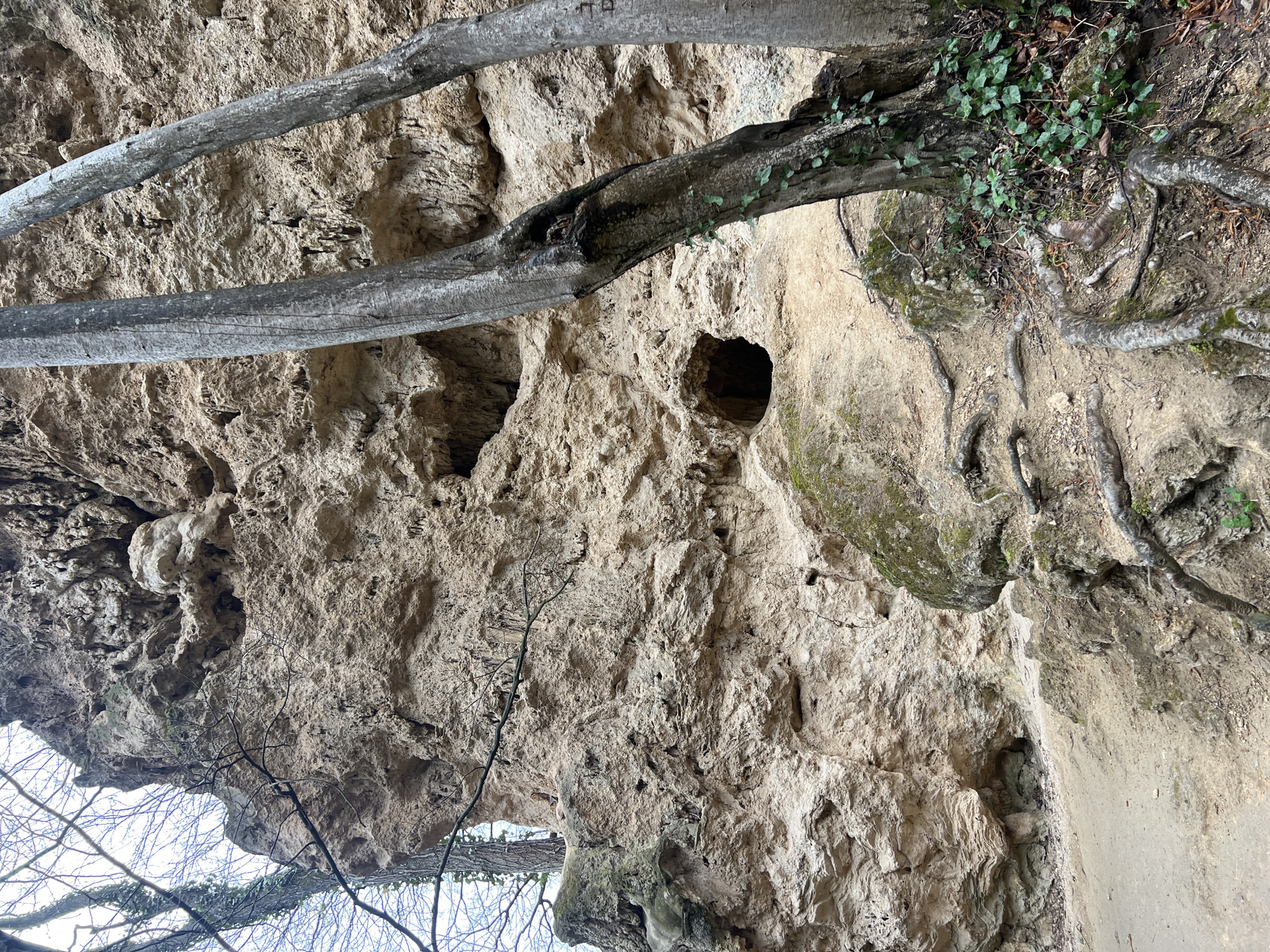 The scene depicts a natural outdoor environment located in Despotovac Municipality, Serbia. A large, light-colored limestone rock face dominates the left and central portions of the frame, exhibiting extensive erosion, pitting, and irregular texture. Two distinct, dark cave entrances are visible: a larger, rounded opening centrally located in the lower-middle section of the rock, and a smaller, elongated opening positioned above and to its left. Numerous smaller cavities and overhangs are present across the entire rock surface. To the right, two slender, greyish-brown tree trunks with minimal foliage rise diagonally, with one showing a small cavity on its surface. Green ivy clings to the base and lower section of the rightmost tree. Exposed, gnarled tree roots snake across the uneven dirt ground in the foreground, where patches of moss and scattered dry leaves are also present. A dirt path or trail extends along the base of the rock face towards the left. Bare tree branches are visible against an overcast sky in the upper left corner. No individuals, animals, or specific actions are depicted.