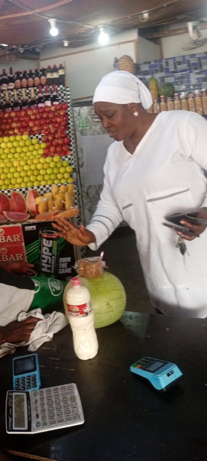 The scene depicts an indoor retail environment, specified as being in Aviation Quarters, Nigeria, likely a fruit stand or small grocery shop