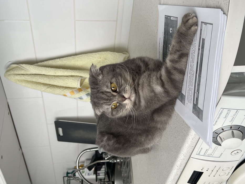 - "This image captures a domestic short-haired cat, likely a Scottish Fold due to its distinctive folded ears, positioned on a kitchen countertop in a residence located in Votkinsk, Russia" by FM-A5lOj2, licensed under CC BY 4.0
