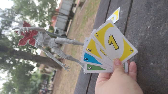 A person holds Uno cards with the numbers 1, 6, 3, and 8 displayed in yellow, blue, and green. In the background is a Demogorgon figure, a truck, trees, and a picnic table. The image is slightly blurred with an off-center angle.