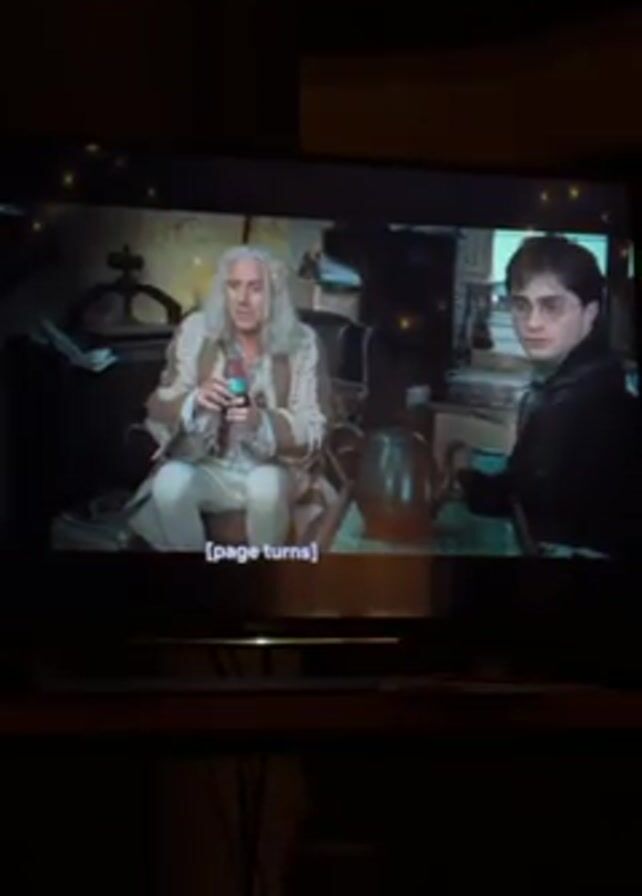 television screen displaying a scene from a movie, likely a Harry Potter film