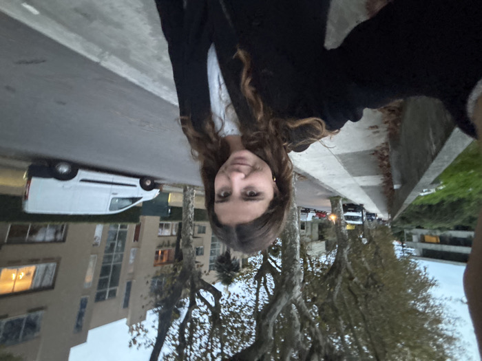 A street scene in Aldoar, Foz do Douro e Nevogilde, Portugal, captures a young female subject in a selfie. The woman, positioned slightly right of center, has long, wavy brown hair, a subtle smile, and wears a dark-colored overcoat over a light-colored top, with a small gold hoop earring in her right ear. Her left arm is partially visible in the upper-left, holding the camera. The setting is a paved sidewalk, sparsely covered with fallen leaves, running parallel to a two-lane street. A line of deciduous trees with sparse foliage borders the sidewalk. To the left of the sidewalk, a concrete retaining wall borders an overgrown, vegetated embankment, with a multi-story building visible in the distance. To the right, a white panel van is parked parallel to the curb, facing left, with additional parked vehicles further down the street. Across the street, a row of modern, multi-story buildings with light-colored facades and numerous windows, some illuminated, are visible. The sky is overcast and grey, indicating dim daylight or dusk.