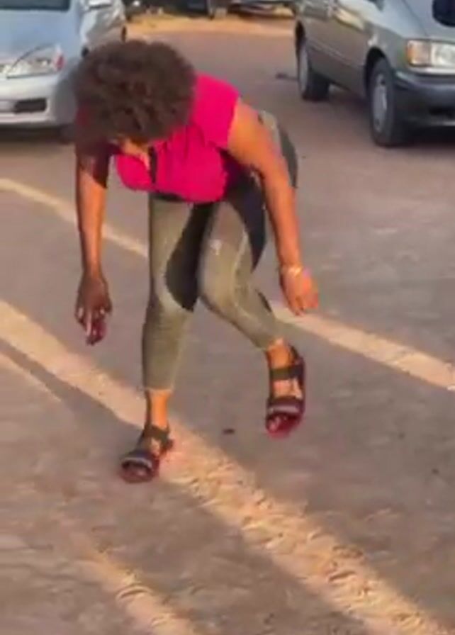 A woman with dark, curly hair is dancing in an open, dirt-covered area
