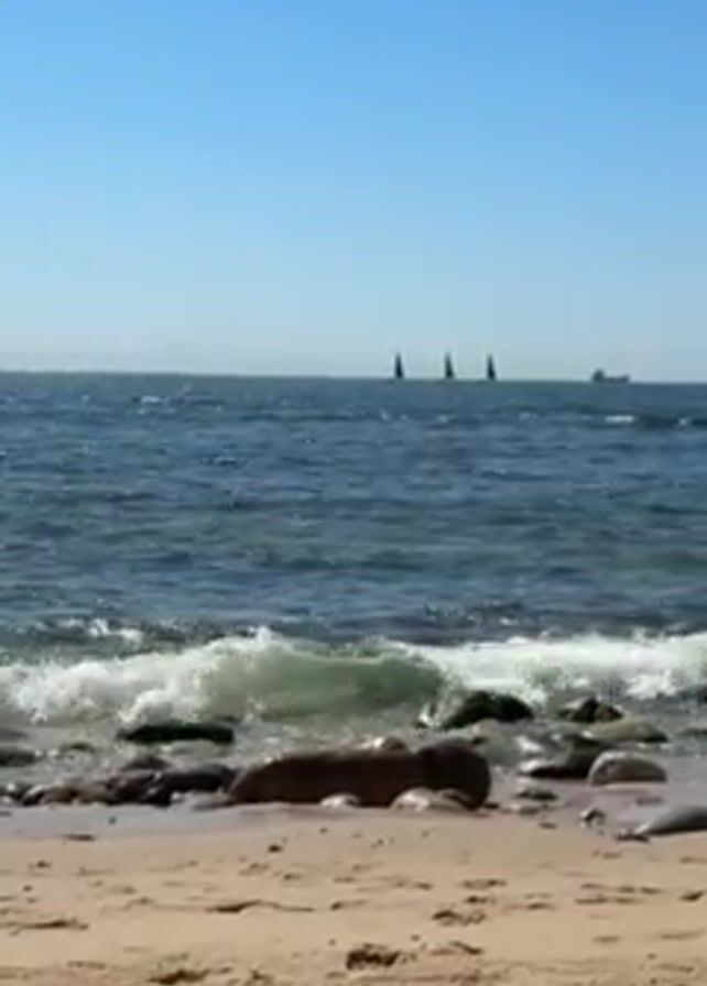sunny beach scene. There is light tan sand on the beach, and several dark rocks are near the water's edge. The ocean is blue with small waves lapping at the shore. In the distance, there are three sailboats with black sails and a larger cargo ship. The sky is clear and blue.