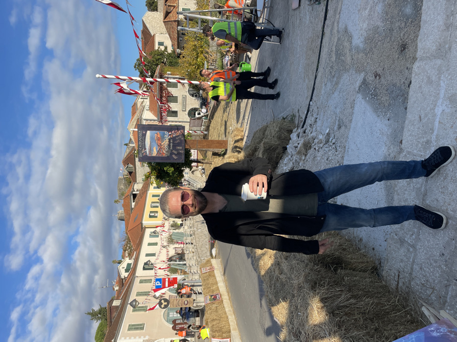 The image depicts an outdoor urban scene in Herceg Novi, Montenegro, under a partly cloudy sky with evident sunlight. A male subject stands centrally in the foreground, facing the camera. He has short, light-colored hair, a beard, and wears reflective sunglasses, a dark jacket over a green t-shirt, blue jeans, and dark sneakers, holding a white disposable cup in his right hand. Behind the subject, a paved street curves, lined with hay bales acting as barriers. To the left, a vintage-style automobile is partially visible on the street near a red "P" parking sign. Buildings with light-colored facades and terracotta roofs line the street, adorned with red and white bunting. In the background on the right, several individuals wearing high-visibility yellow and orange vests are present, some standing, some seated near temporary event infrastructure. A prominent wooden sign displays a "RALLYE AUTOMOBILE MONTE CARLO - Depuis 1911" poster. Further right, a tall red and white striped pole stands near a building explicitly marked "COIFFEUR." In the distant background, a stone fortress or castle is visible on a hill. The overall environment suggests an event, possibly a historical rally or festival, is either being set up or is underway.