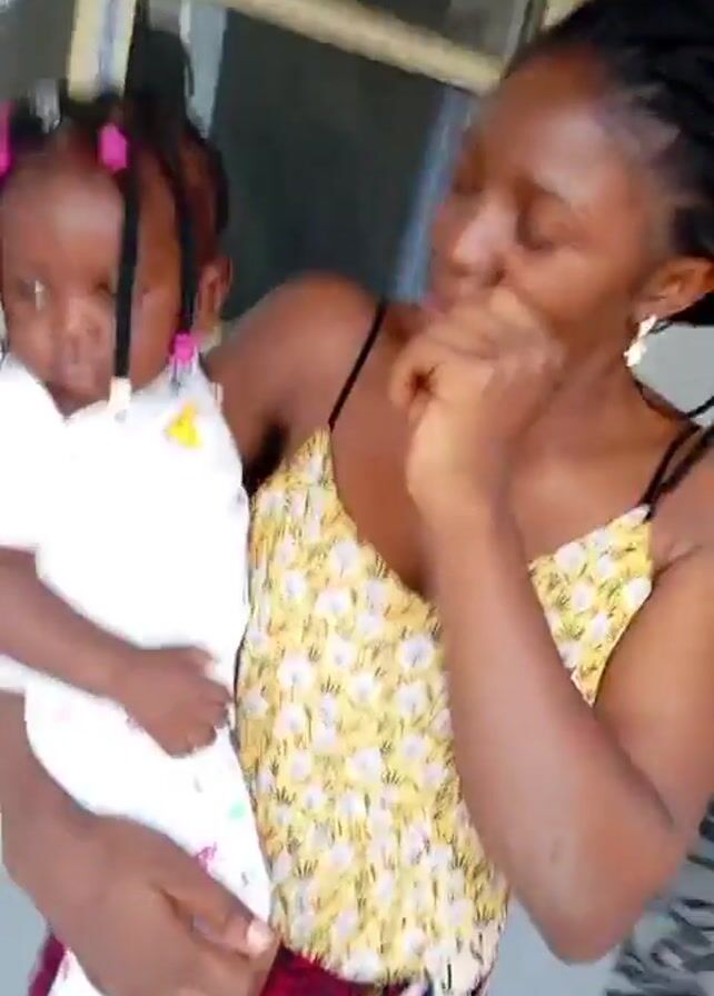 A woman in a yellow patterned tank top is holding a baby in her arms. The baby has dark skin, with dark braids and pink hair clips. The baby is wearing a white onesie with colorful polka dots. A man is holding the baby's hands. The woman smiles and says hello to the camera. The background shows a window with a white frame and a gray wall.