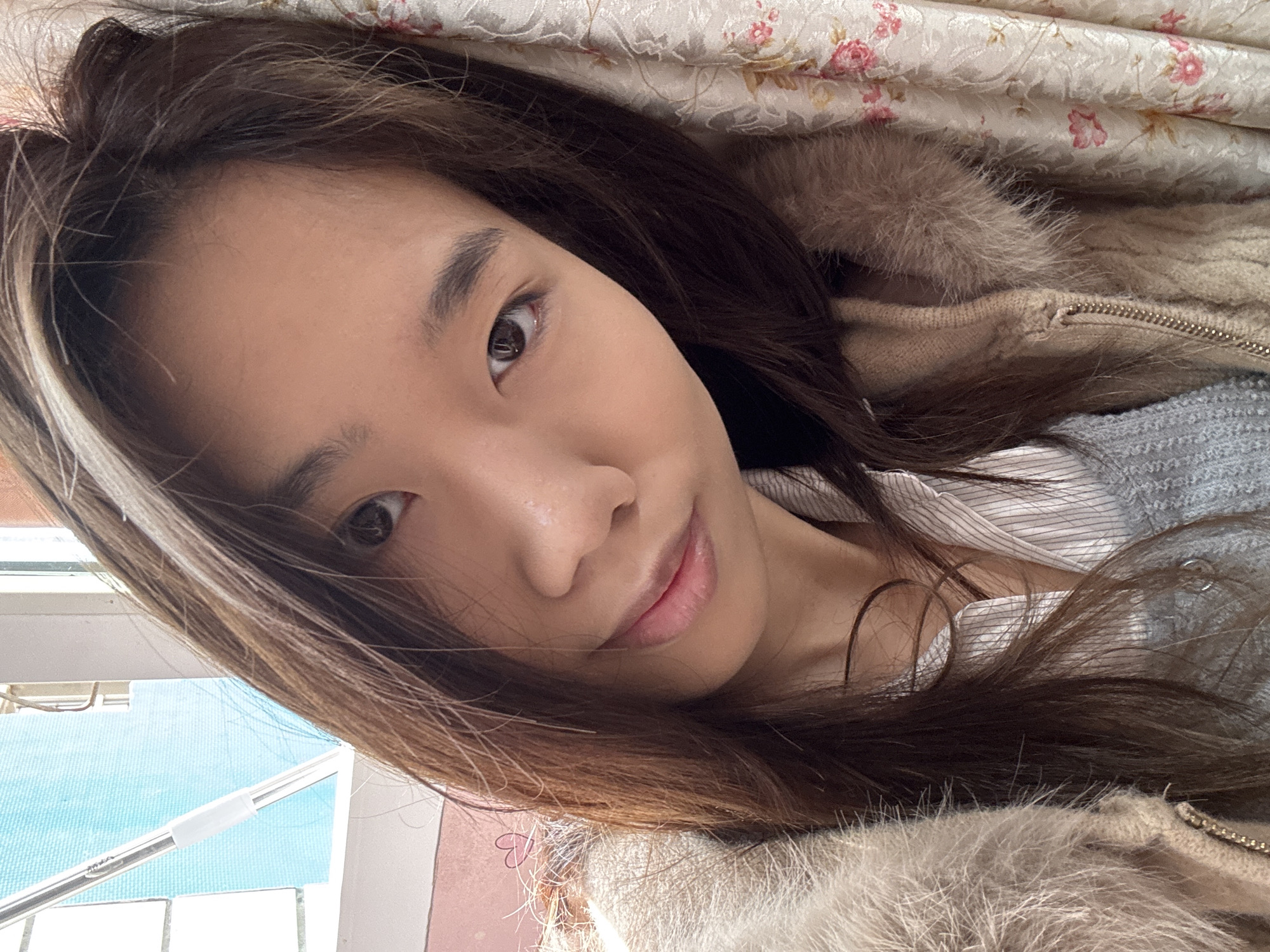 A young Asian woman is pictured in a close-up, selfie-style shot. The woman is looking directly at the camera with a soft, slight smile. Her long, brown hair is styled with a blonde highlight near the front. The woman is wearing a light-colored collared shirt and a tan-colored jacket with a fur trim. Above the woman's head is a floral-patterned material. To the left of the image, the background reveals a window and part of a blue exterior. The city of Shapingba District, China cannot be confirmed as the location.