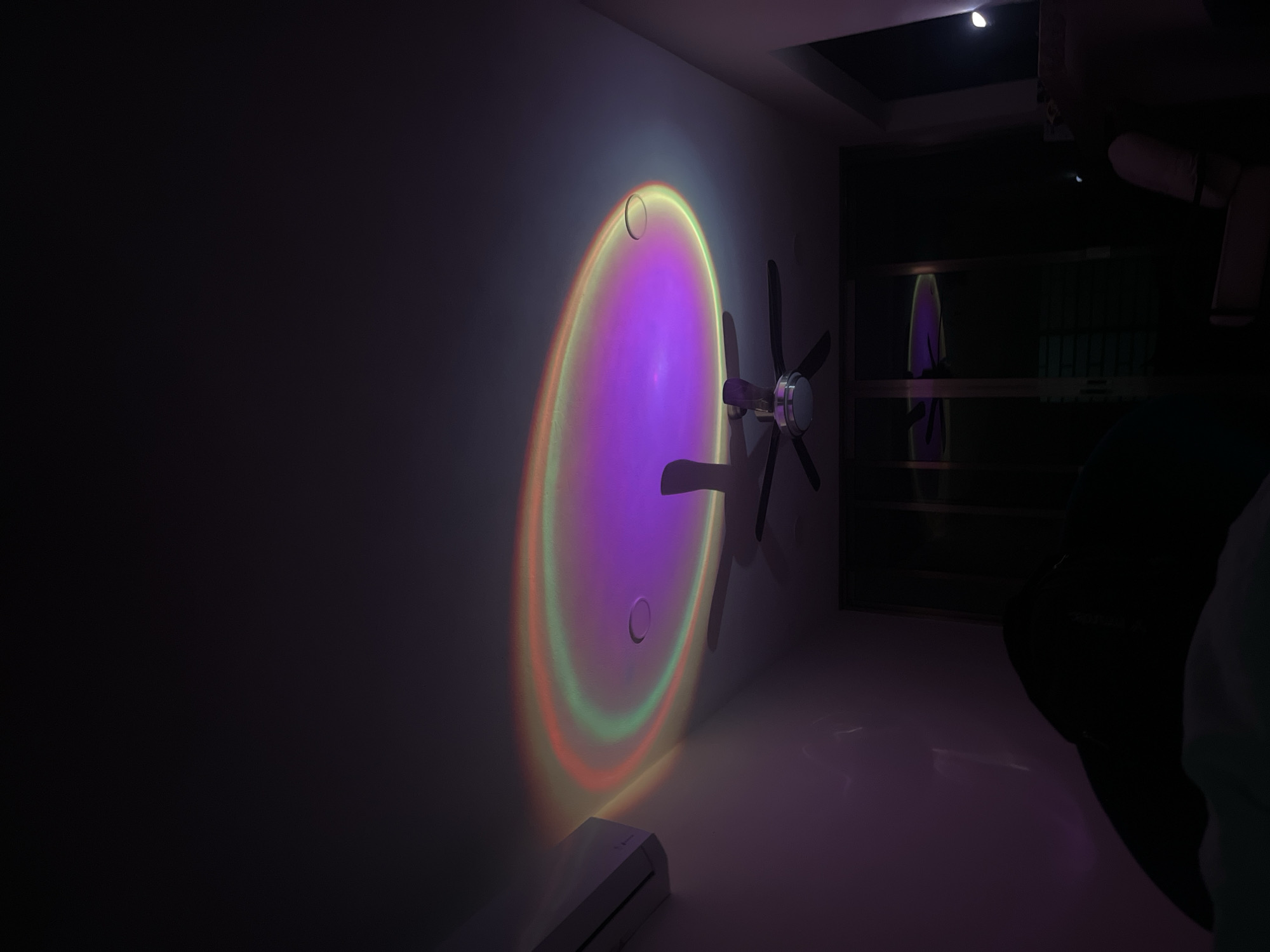 The image depicts an indoor room, identified as being in Mérida, Mexico, under low-light conditions, indicative of nighttime or a darkened interior. A prominent elliptical light projection, displaying concentric bands of purple, green, and orange/red, illuminates the light-colored ceiling. Positioned centrally below this projection is a dark-colored ceiling fan equipped with four blades and a central light fixture. A white wall-mounted air conditioning unit is located on the upper left wall. A single white circular recessed light fixture is visible on the ceiling, to the upper right of the elliptical projection's center. The background features a large, dark glass sliding door or window system, beyond which a single, indistinct light source is visible on the far right. The foreground contains dark, amorphous shapes consistent with furniture, suggesting a bed or sofa on the left and a chair on the right. No individuals are present in the scene.