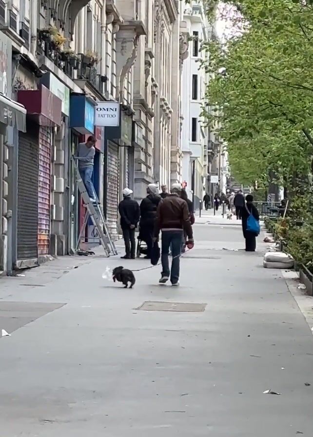 sidewalk scene in what appears to be an urban area. A man is standing on a ladder, working on the signage of a store named "OMNI TATTOO". Several people are walking along the sidewalk, including one person walking a small dog on a leash. Other people are standing near the ladder, observing the work being done. The street is lined with buildings, some with closed storefronts. Trees are visible on one side of the sidewalk. The overall impression is a typical street scene with ongoing activity.