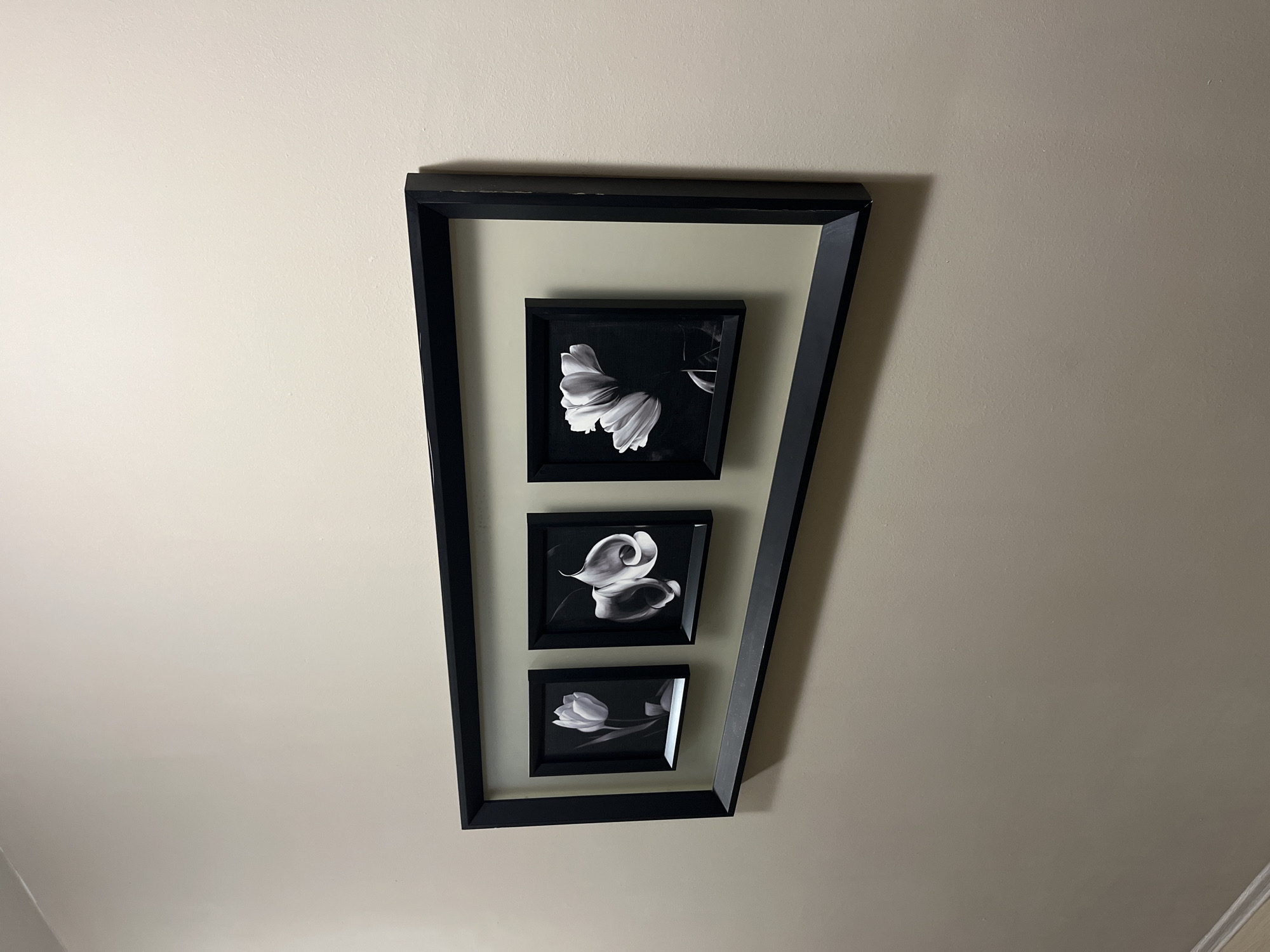 black, decorative frame hanging on a wall. The frame is rectangular with a slightly trapezoidal shape. Inside the larger frame are three smaller, square black frames arranged vertically. Each smaller frame contains a black and white image of a flower. The wall is a neutral color. The image does not provide information regarding the location in the city of Kameno, Bulgaria.