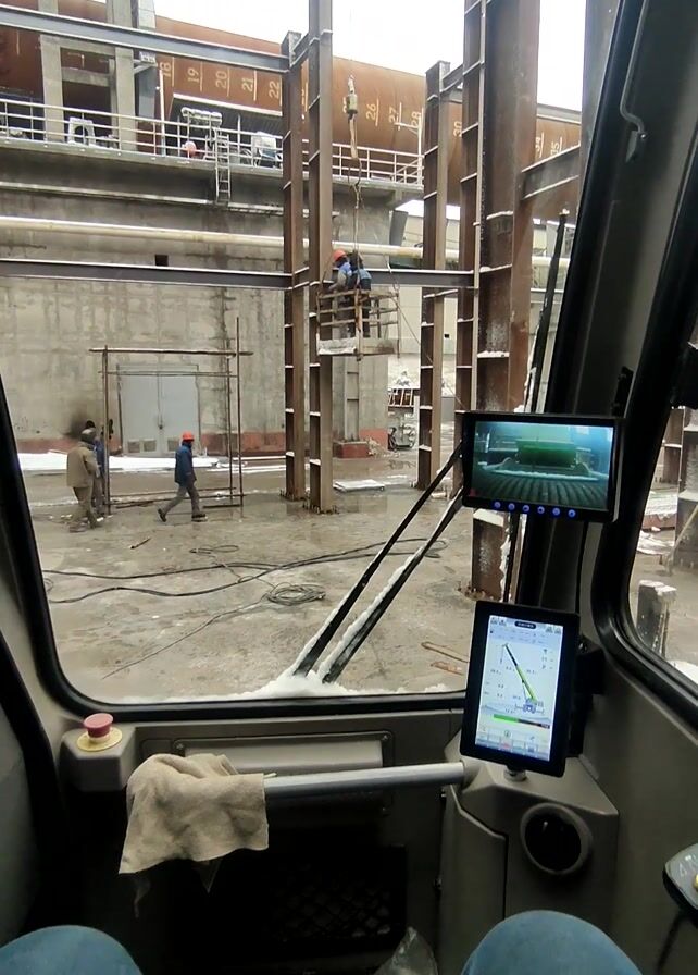 view from inside what appears to be the cab of a crane or similar heavy machinery