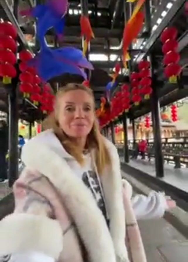 A woman stands holding a camera, pointing it toward herself. She is smiling. She is wearing a white hoodie and a light pink and white plaid coat with a white fur collar. Above her head is a dark wooden frame structure, from which hang many red Chinese lanterns and colorful fish ornaments. The woman turns the camera slightly, revealing a walkway in the background. There are other people walking along the walkway.