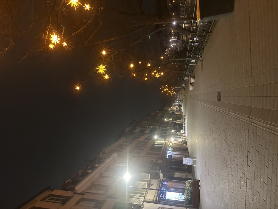 An evening street scene features bare-branched trees adorned with bright, star-shaped lights above buildings with white shutters. A wide, paved walkway runs alongside the buildings, illuminated by streetlights. On the right, a railing separates the walkway from a darker area. The overall lighting creates a warm, inviting atmosphere, hinting at a festive occasion. The image has been rotated 90 degrees counterclockwise.