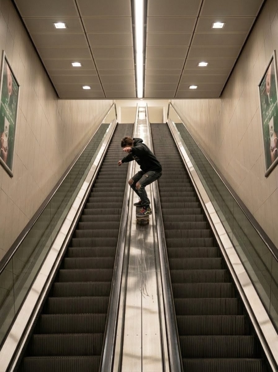 - "An individual is depicted skateboarding down the central metal divider between two escalators at Serdika Metro Station in Sofia, Bulgaria" by FM-C7UI02, licensed under CC BY 4.0