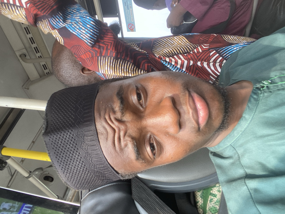 An image taken inside a public transport vehicle, likely a bus, in Ebute-Metta, Nigeria, captures a close-up selfie of a young Black male with other passengers in the background