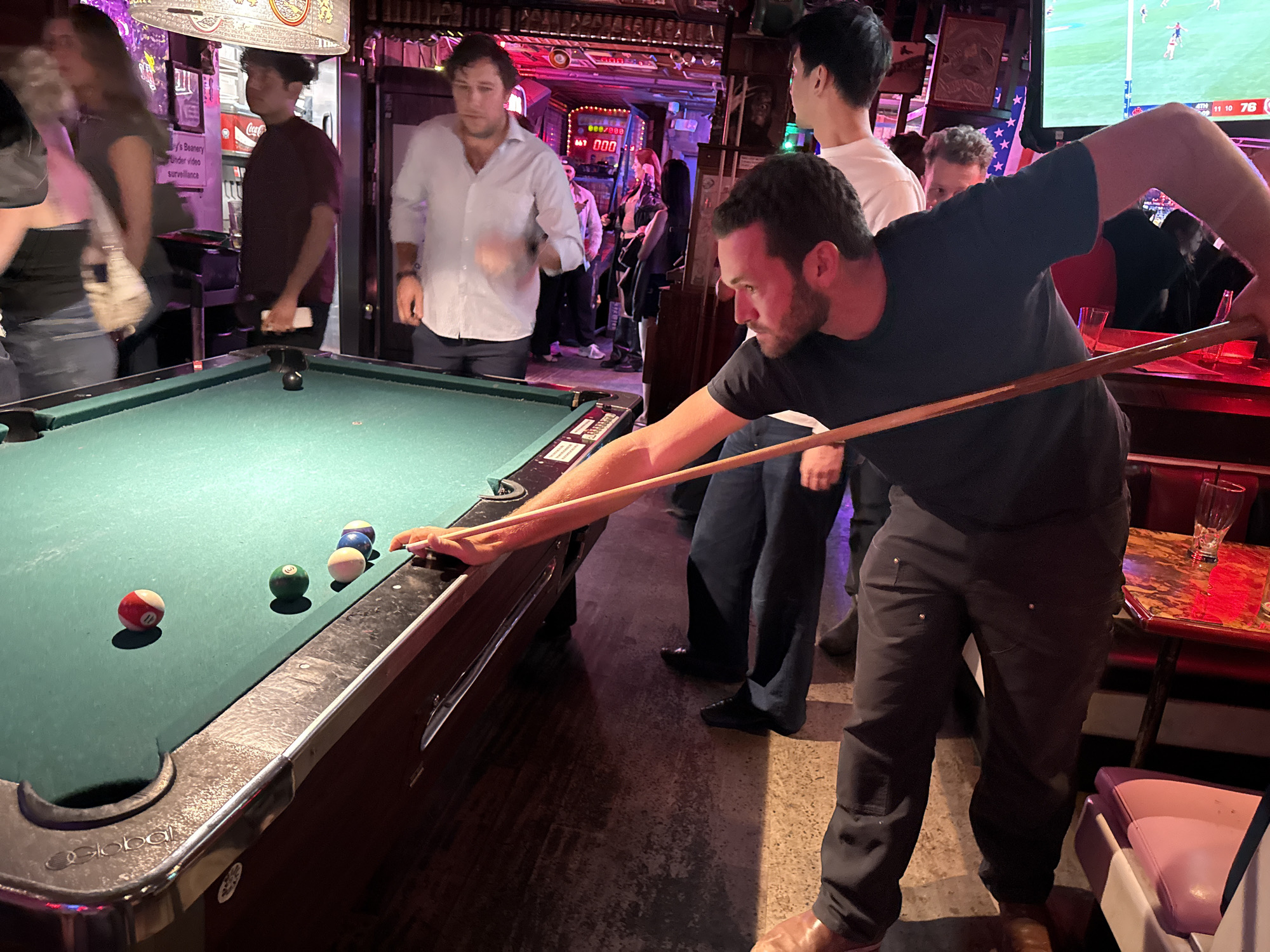 The photo was taken inside Barney's Beanery, a bar in West Hollywood, United States of America. It captures a crowded scene with a man focused on playing pool. He is bent over a pool table with three visible pool balls (red-11, green-6, and blue-white) positioned on the green felt. The man is holding a pool cue, aiming it at the balls. He is wearing a dark short-sleeve shirt and dark pants, with brown shoes visible on his left foot. The room is dimly lit with a mix of natural and artificial lighting. Several people are standing around the pool table, watching. A television screen displaying a sporting event is visible in the background. The room also includes other bar elements like tables, chairs, and decor.