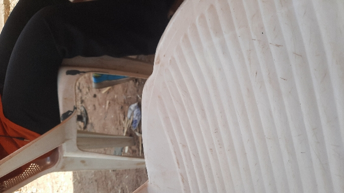 The scene depicts an outdoor environment in Panshekara, Nigeria. In the immediate foreground, the ribbed, off-white plastic seat of a chair occupies the lower half of the frame. This seat shows signs of wear and dirt accumulation. In the midground, partially visible, a person is seated on another light-colored plastic chair. The individual is wearing dark-colored trousers and an orange garment. Black earphones or headphones are visible near their neck. The chair the person is occupying has a perforated backrest and is also made of plastic. The ground surface visible behind and beneath the chairs is reddish-brown, appearing dusty or sandy, with scattered debris including dry plant matter and a crumpled piece of blue and white material.