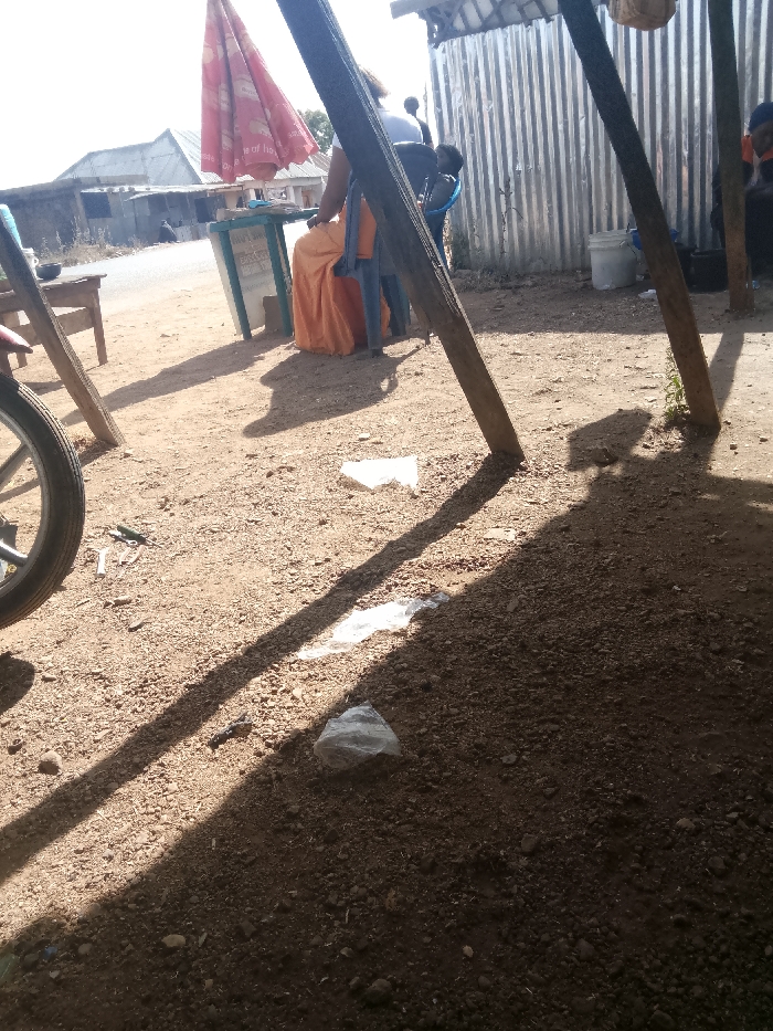 This image depicts an outdoor scene in the city of Unknown, Unknown, characterized by a reddish-brown dirt ground under bright sunlight. In the immediate foreground, the left side shows a portion of a bicycle or motorbike wheel with silver spokes. Two dark wooden posts are angled from the upper left to the lower right, casting long, sharp shadows across the dirt. Scattered on the ground are several pieces of white plastic litter and small stones. In the mid-ground, a light blue and white stall is positioned, partially obscured by a red and white striped umbrella that bears faint text. Behind this stall, a person dressed in an orange garment stands facing away from the camera. A blue chair is visible adjacent to this individual. Further behind them, another person wearing a white shirt is partially visible. To the far left in the background, a paved road is discernable, with indistinct buildings and foliage further in the distance. One individual is seated on the ground near this road. To the right in the background, a corrugated metal sheet wall forms part of a structure. A white plastic bucket rests on the ground near this wall, and another person in an orange garment is partially visible, seated or leaning against an unseen object to the far right. The overall lighting suggests a clear day with strong overhead sun.